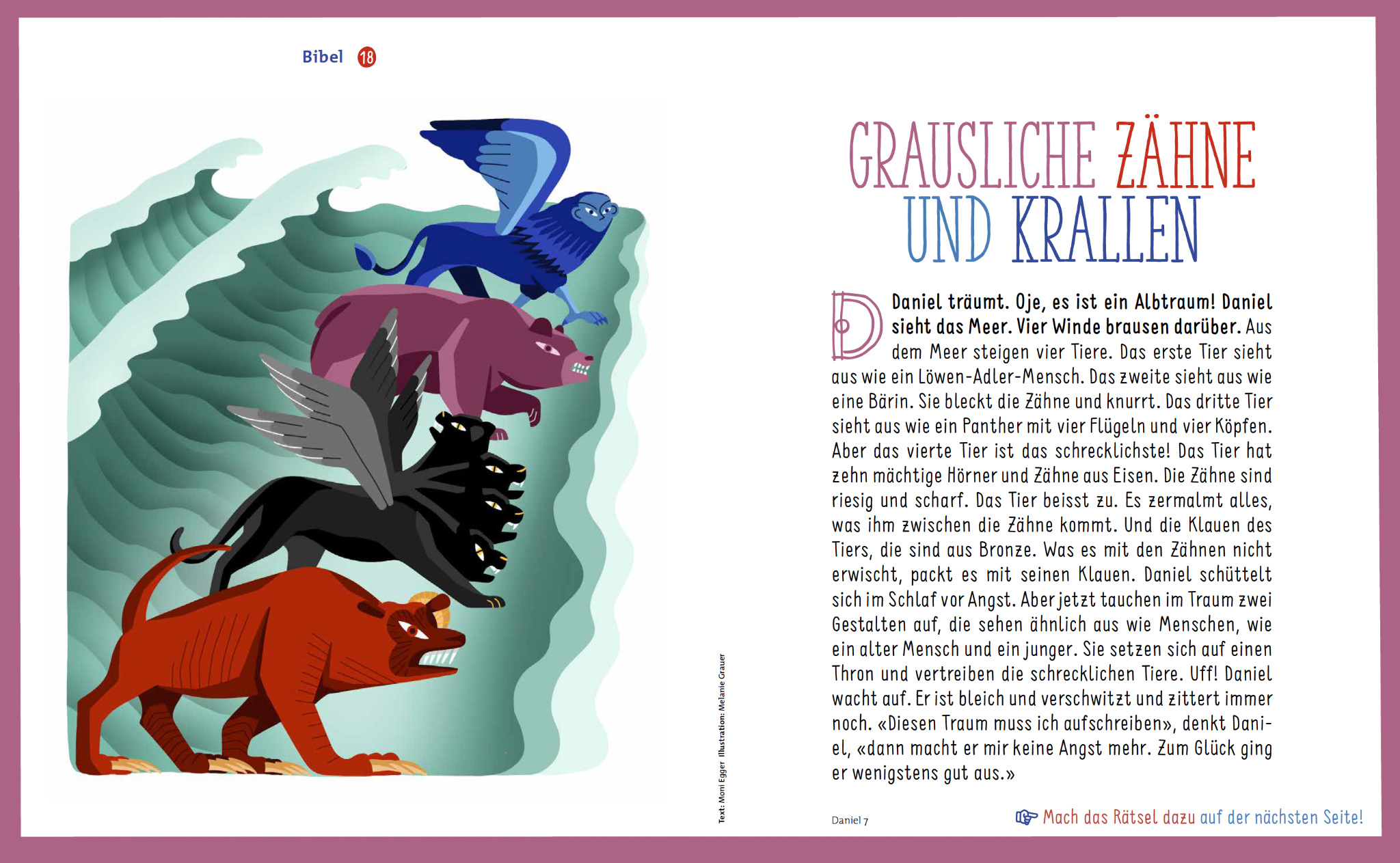 Aus dem Meer steigen vier Tiere. Das erste Tier sieht aus wie ein Löwen-Adler-Mensch. Das zweite sieht aus wie eine Bärin. Sie bleckt die Zähne und knurrt. Das dritte Tier sieht aus wie ein Panther mit vier Flügeln und vier Köpfen. Aber das vierte Tier ist das schrecklichste! Das Tier hat zehn mächtige Hörner und Zähne aus Eisen. Die Zähne sind riesig und scharf. Das Tier beisst zu. Es zermalmt alles, was ihm zwischen die Zähne kommt. Und die Klauen des Tiers, die sind aus Bronze.