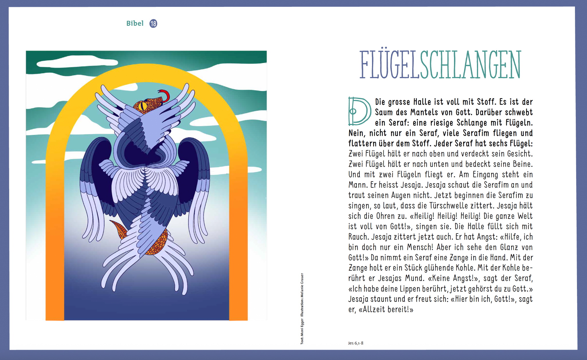 Am Eingang steht ein Mann. Er heisst Jesaja. Jesaja schaut die Serafim an und traut seinen Augen nicht. Jetzt beginnen die Serafim zu singen, so laut, dass die Türschwelle zittert. Jesaja hält sich die Ohren zu. «Heilig! Heilig! Heilig! Die ganze Welt ist voll von Gott!», singen sie. Die Halle füllt sich mit Rauch. Jesaja zittert jetzt auch. Er hat Angst: «Hilfe, ich bin doch nur ein Mensch! Aber ich sehe den Glanz von Gott!» Da nimmt ein Seraf eine Zange in die Hand. Mit der Zange holt er ein Stück glühende Kohle. Mit der Kohle berührt er Jesajas Mund. «Keine Angst!», sagt der Seraf, «Ich habe deine Lippen berührt, jetzt gehörst du zu Gott.» Jesaja staunt und er freut sich: «Hier bin ich, Gott!», sagt er, «Allzeit bereit!»