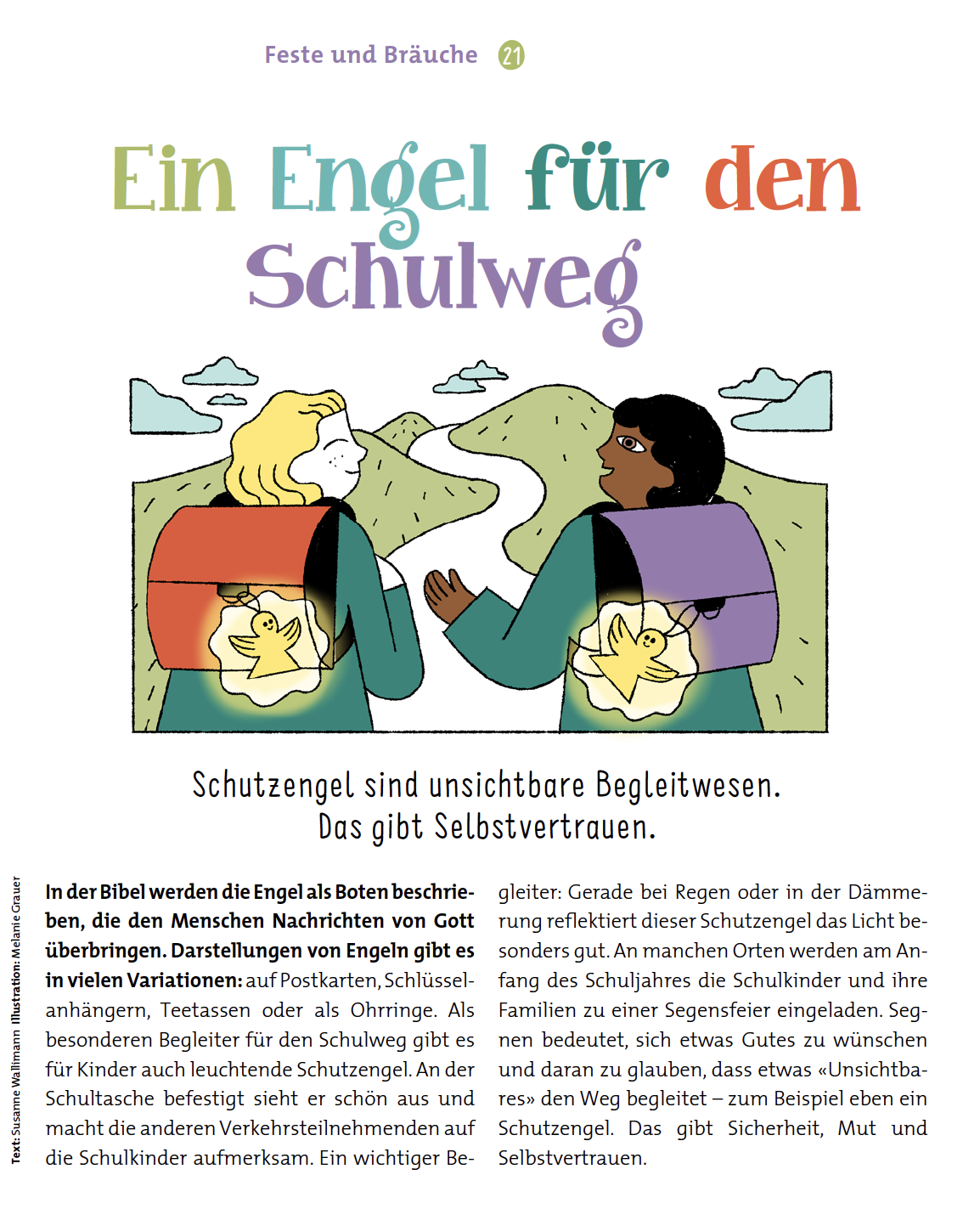An der Schultasche befestigt sieht er schön aus und macht die anderen Verkehrsteilnehmenden auf die Schulkinder aufmerksam. Ein wichtiger Begleiter: Gerade bei Regen oder in der Dämmerung reflektiert dieser Schutzengel das Licht besonders gut. An manchen Orten werden am Anfang des Schuljahres die Schulkinder und ihre Familien zu einer Segensfeier eingeladen. Segnen bedeutet, sich etwas Gutes zu wünschen und daran zu glauben, dass etwas «Unsichtbares» den Weg begleitet – zum Beispiel eben ein Schutzengel. Das gibt Sicherheit, Mut und Selbstvertrauen.