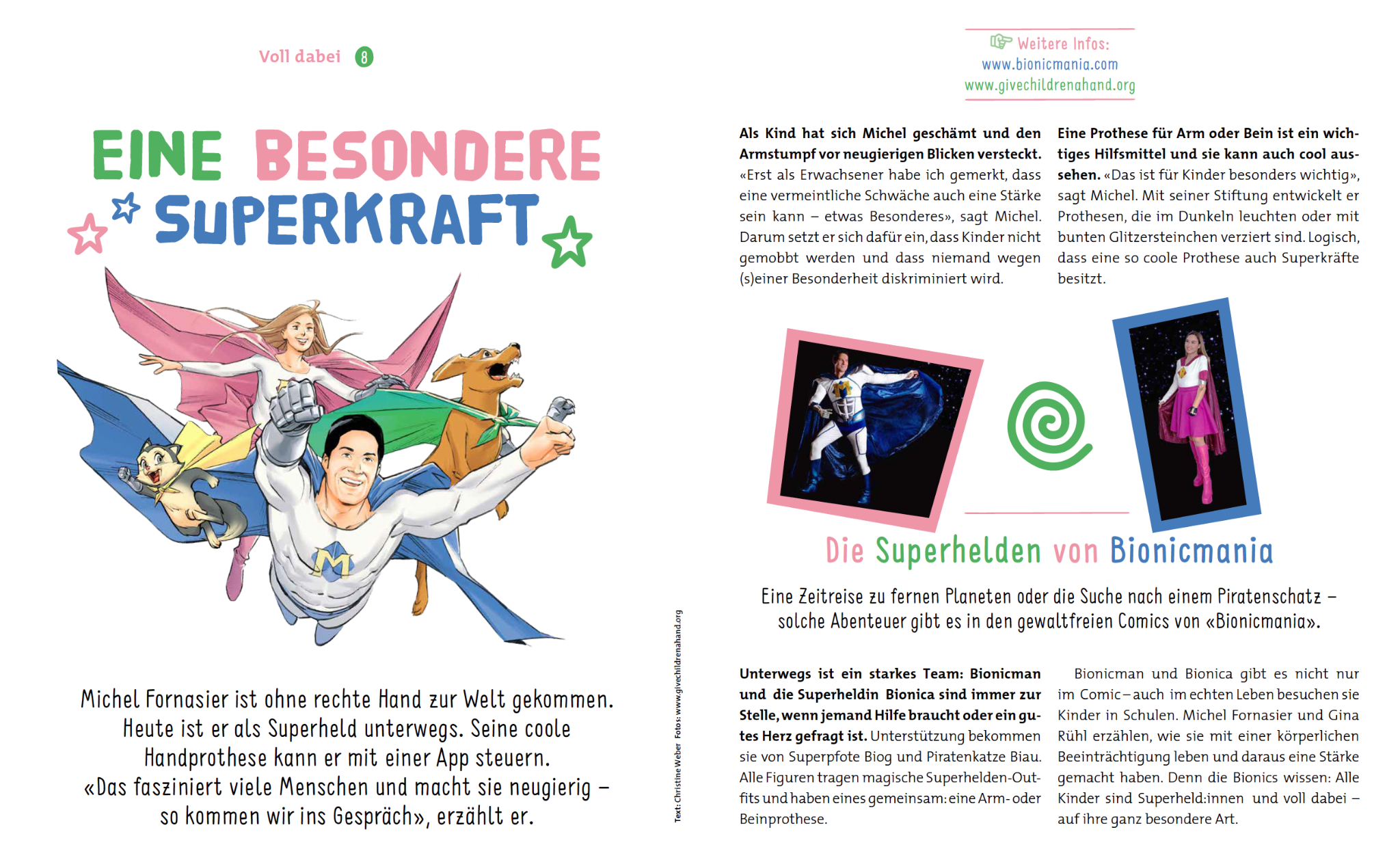 Bionicman und Bionica gibt es nicht nur im Comic – auch im echten Leben besuchen sie Kinder in Schulen. Michel Fornasier und Gina Rühl erzählen, wie sie mit einer körperlichen Beeinträchtigung leben und daraus eine Stärke gemacht haben. Denn die Bionics wissen: Alle Kinder sind Superheld:innen und voll dabei – auf ihre ganz besondere Art.
