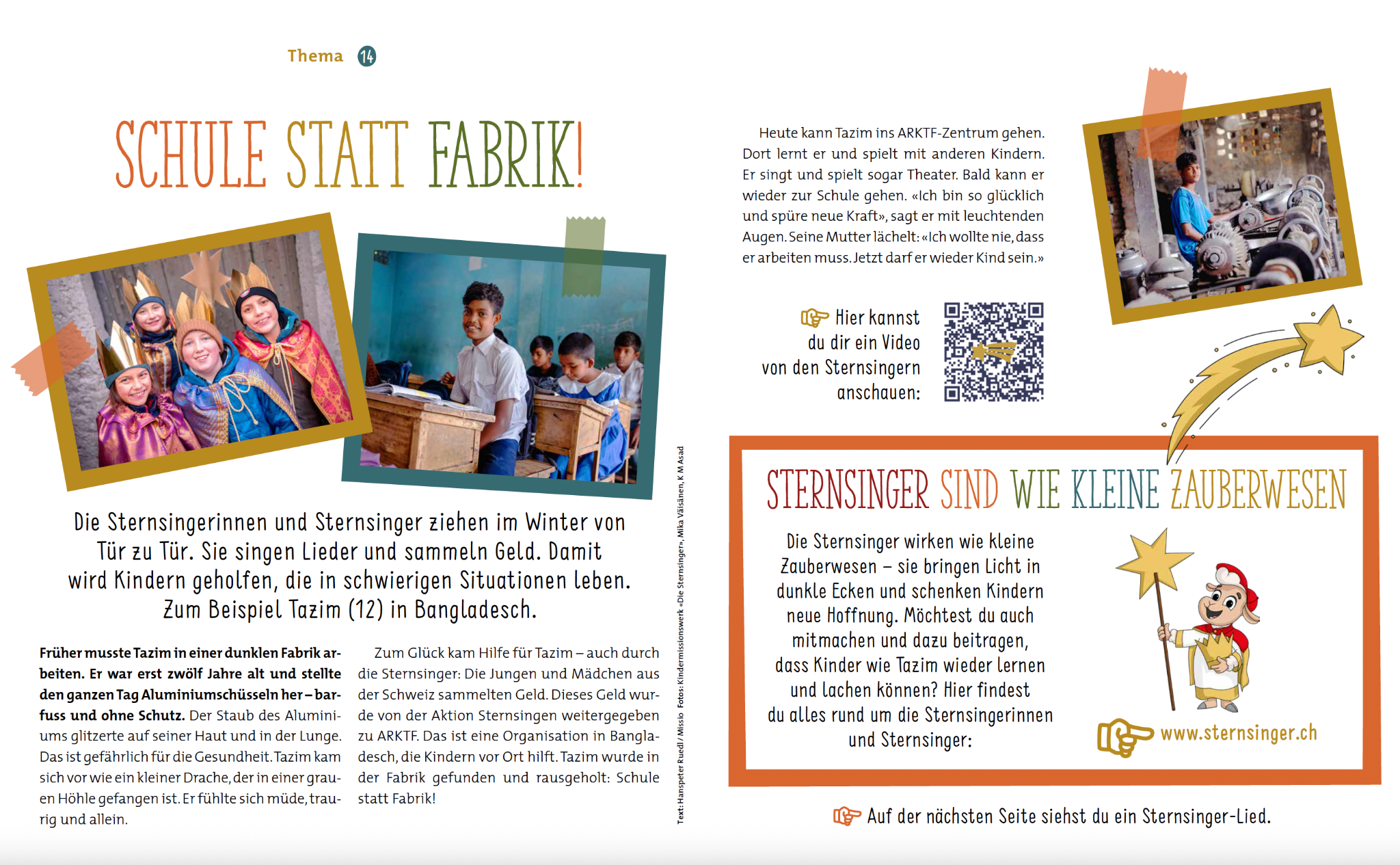 Der 12-Jährige Tazim arbeitete früher in einer dunklen Fabrik in Bangladesch. Dort stellte er den ganzen Tag Aluminiumschüsseln her – barfuss und ohne Schutz. Zum Glück kam Hilfe für Tazim – auch durch die Sternsinger: Die Jungen und Mädchen aus der Schweiz sammelten Geld. Dieses Geld wurde von der Aktion Sternsingen weitergegeben an eine Organisation in Bangladesch, die Kindern vor Ort hilft. Tazim wurde in der Fabrik gefunden und rausgeholt. Nun darf Tazim wieder Kind sein und mit anderen Kindern spielen.