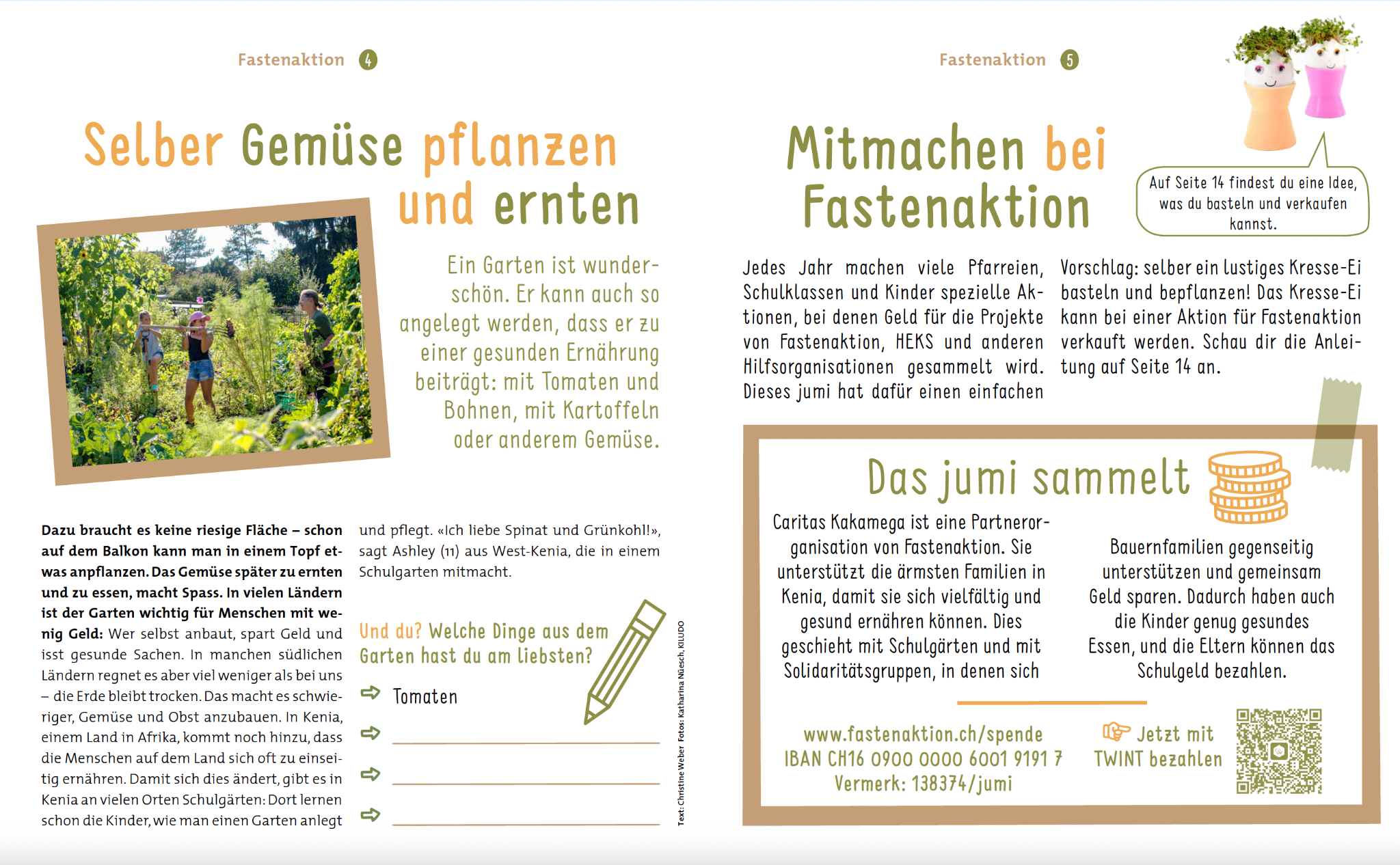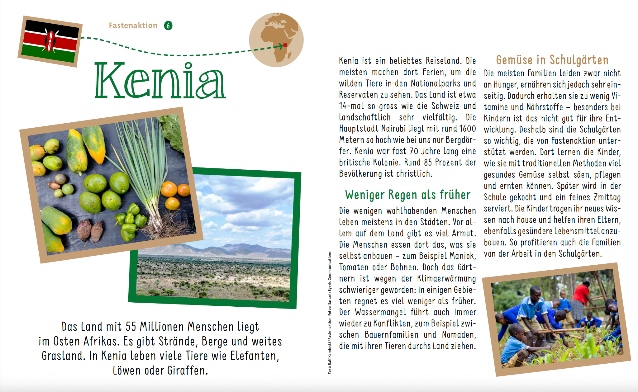 Caritas Kakamega ist eine Partnerorganisation von Fastenaktion. Sie unterstützt die ärmsten Familien in Kenia, damit sie sich vielfältig und gesund ernähren können. Dies geschieht mit Schulgärten und mit Solidaritätsgruppen, in denen sich Bauernfamilien gegenseitig unterstützen und gemeinsam Geld sparen. Dadurch haben auch die Kinder genug gesundes Essen, und die Eltern können das Schulgeld bezahlen.